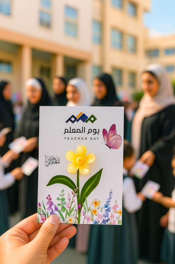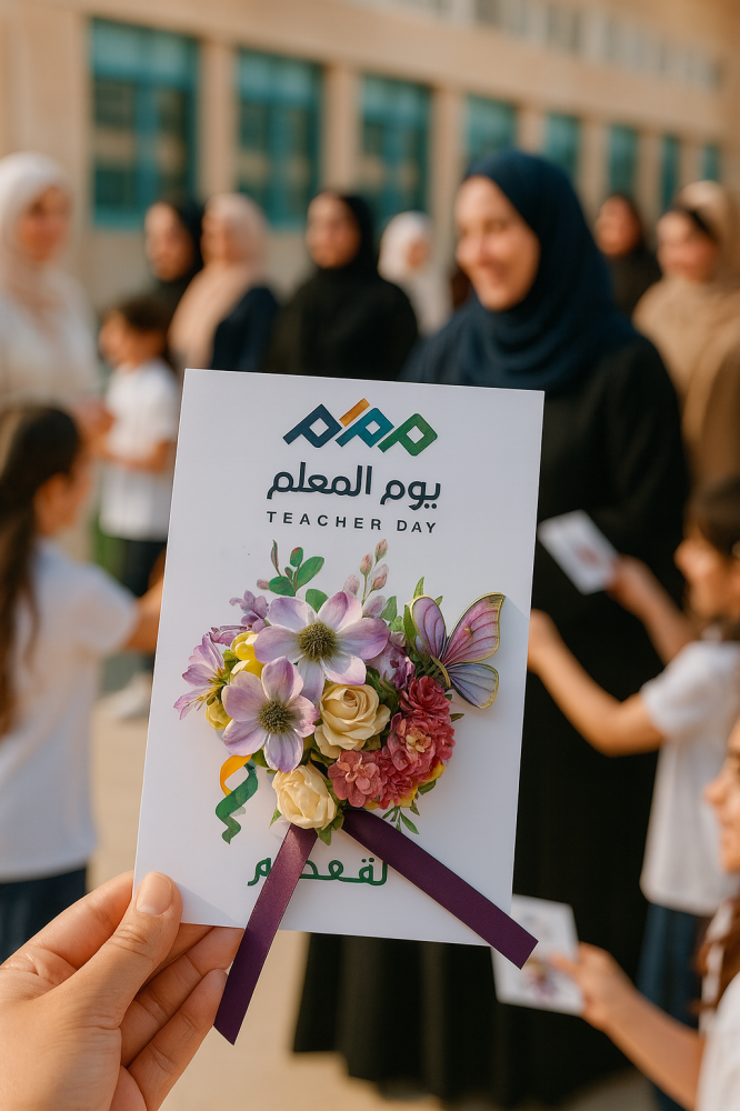 بطاقة شكر أنيقة بألوان زاهية تحمل عبارة "يوم المعلم" بتصميم مطوّر يحافظ على الطابع الخليجي واللمسة الراقية، مرفقة بهدية رمزية بسيطة تضيف لمسة من الفخامة والدفء.